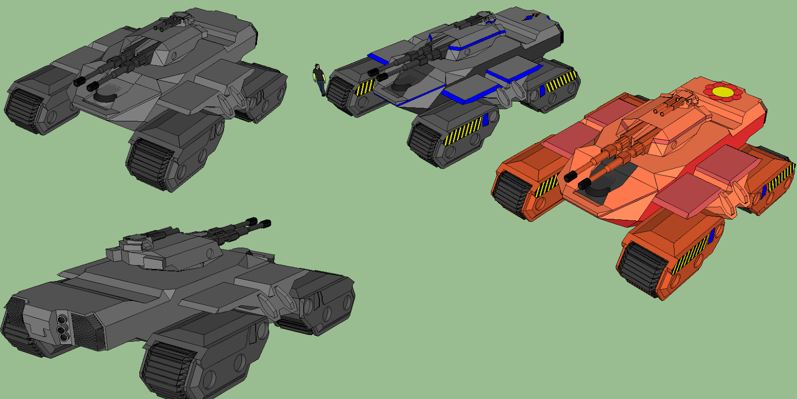 I forgot I had a blog. It has been a while. I will start off with showing a model of a tank I made. It is quite a large tank. The little man is a 6' 9" person. The tank has a twin 150mm floating barrel cannons on a mounted turret. I haven't came up with a name. It comes in two color schemes.